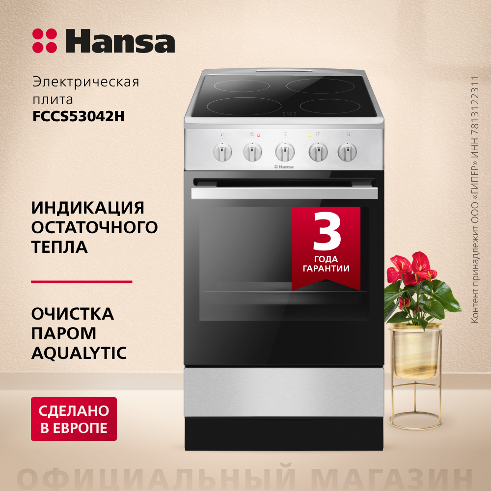 Электрическая плита Hansa FCCS53042H станет практичным и надежным инструментом в приготовлении любимых блюд. Варочная поверхность из закаленного стекла не только станет идеальным дополнением кухонного интерьера, но и порадует своей прочностью. Очистить духовой шкаф можно легко и просто, благодаря системе очистки паром Aqualytic. Узнать подходящие режимы для запекания можно с помощью рецептов на дверце.