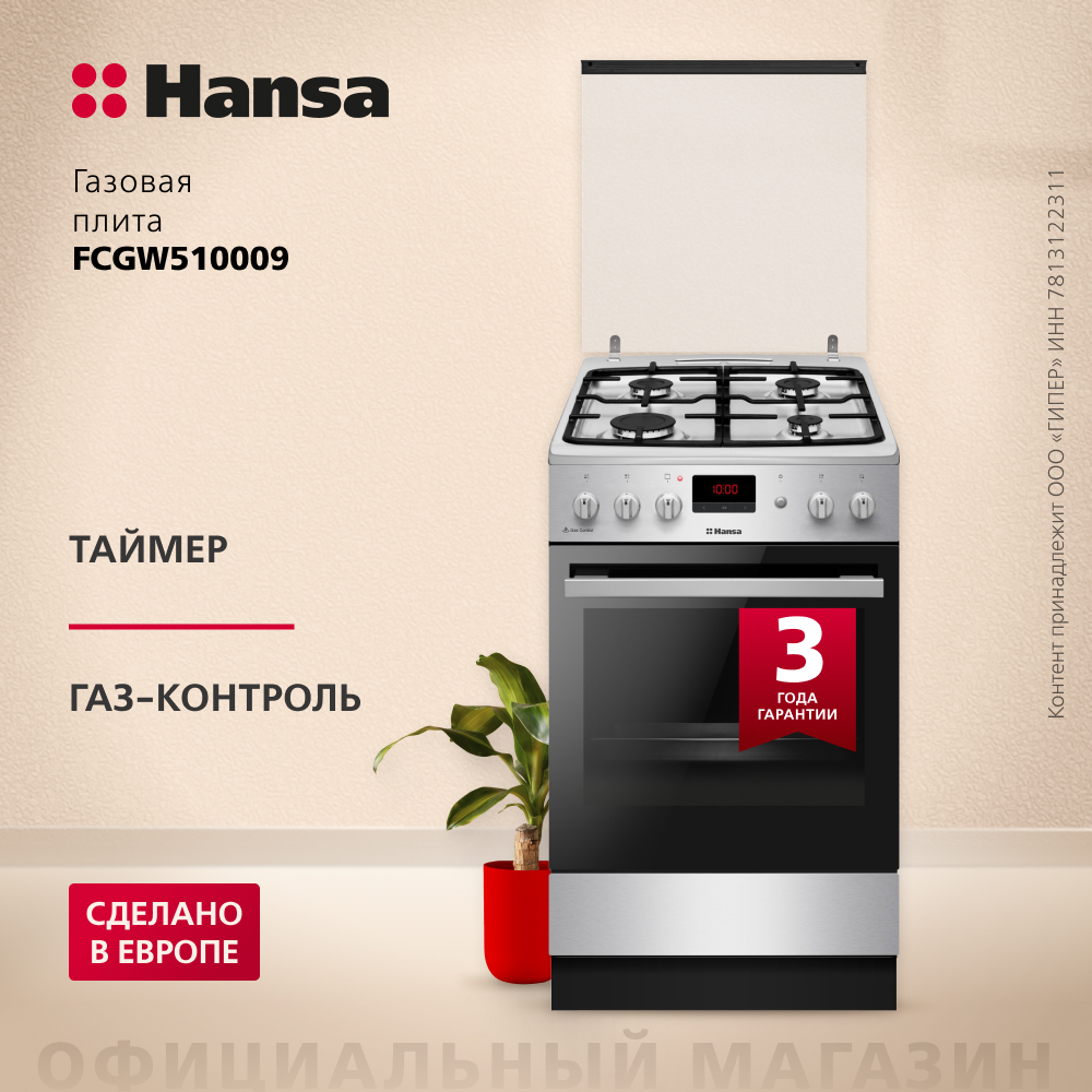 Газовая плита Hansa FCGX522222H отлично впишется в любой современный интерьер и порадует своей практичностью. Варочная поверхность оснащена прочными чугунными решетками, которые не только обеспечивают безопасность во время готовки, но и легкость в уходе за прибором. На дверце духового шкафа можно найти полезные рецепты, которые подскажут нужные настройки. Специальная функция газ-контроль автоматически прекратит подачу газа в случае неисправности. А цифровой таймер позволяет отслеживать время, отведенное на готовку в духовом шкафу.