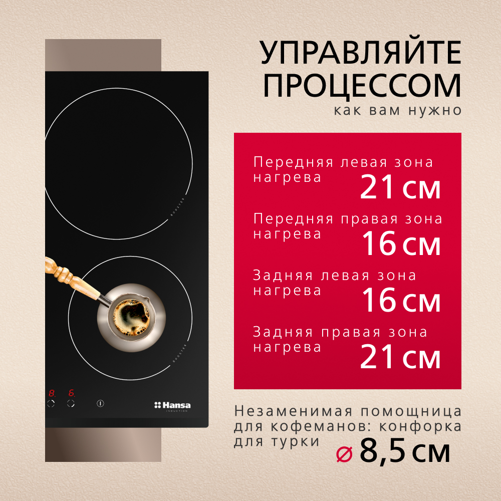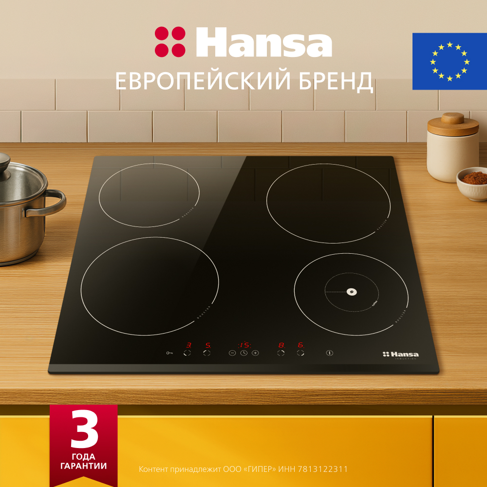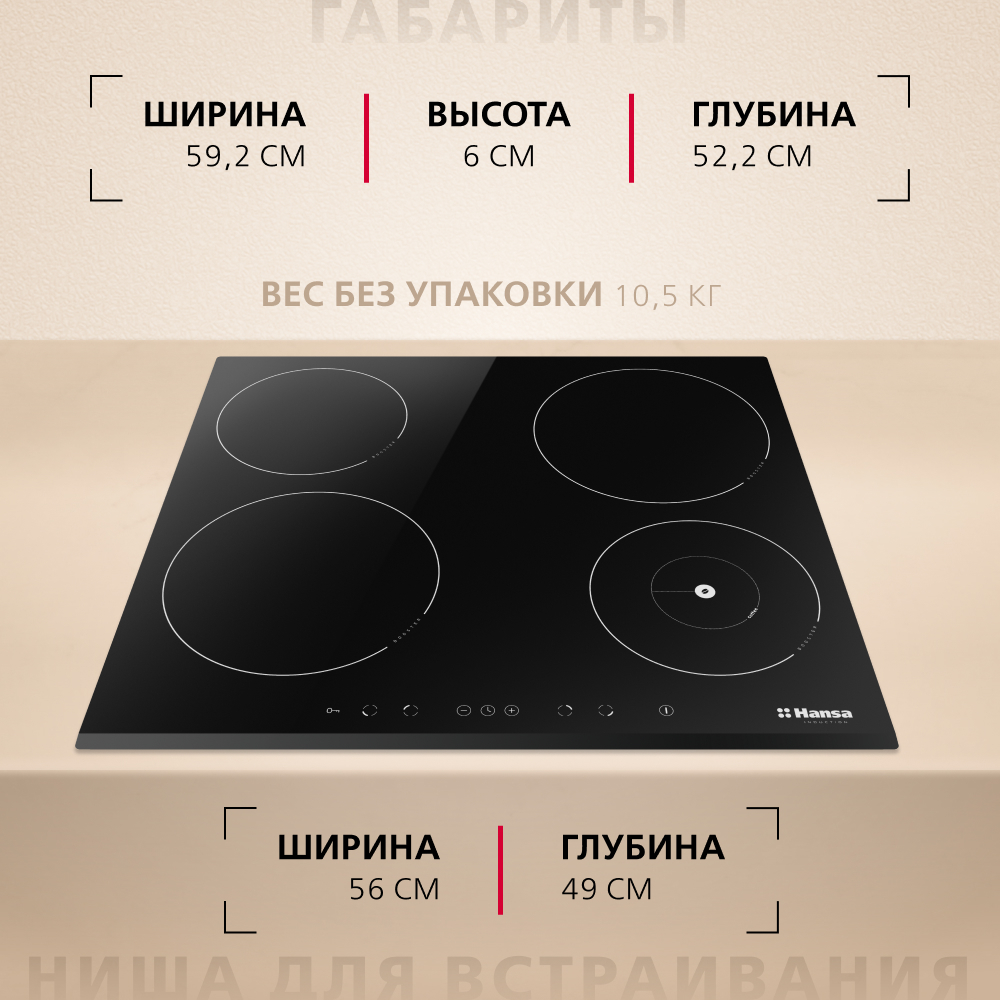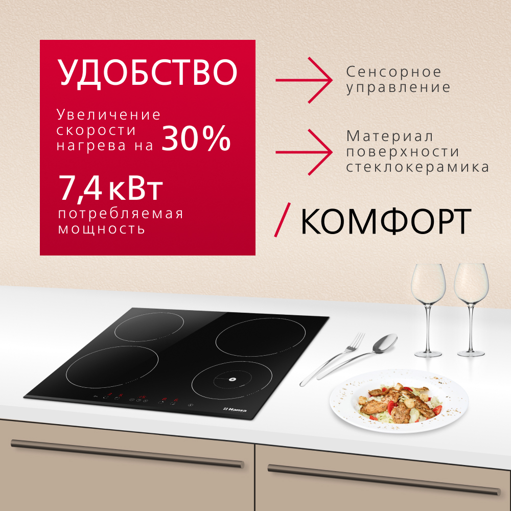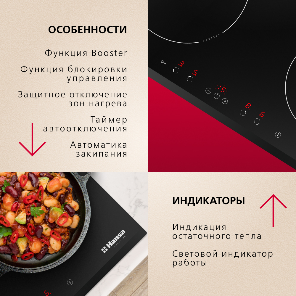 Индукционная варочная панель Hansa BHI68508 в современном черном дизайне станет стильным и умным центром вашей кухни. Четыре зоны нагрева на стеклокерамической поверхности обеспечивают быструю и эффективную готовку. Сенсорное управление позволяет точно настроить мощность каждой конфорки отдельно. Функция Booster кратковременно увеличивает мощность для моментального закипания воды. Автоматика закипания сама переключит нагрев на нужный режим после того, как блюдо начнет кипеть. Таймер автоматически отключит зону нагрева, когда установленное время истечет. Индикация остаточного тепла покажет, какая конфорка еще горячая, чтобы вы не обожглись. Датчики установленной посуды включают нагрев только тогда, когда на панели появится кастрюля или сковорода. Функция блокировки управления обезопасит процесс, если в доме есть дети. Панель оснащена защитным отключением и функцией поддержания тепла, чтобы ваши блюда долго оставались горячими. Скошенные края придают модели аккуратный и законченный вид.