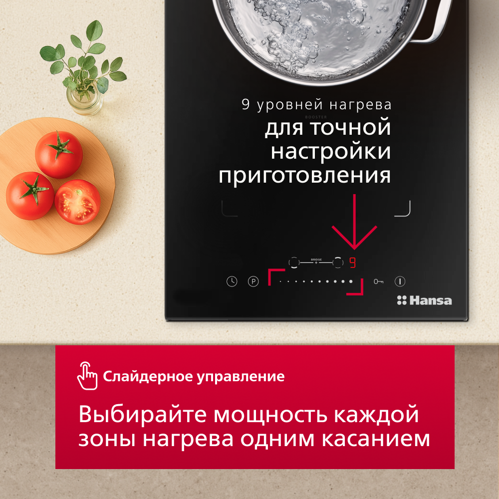 Индукционная варочная панель Hansa BHI38600 сочетает в себе инновационные функции и эргономичный дизайн. Она оснащена двумя зонами нагрева, которые можно объединить в одну протяженную с помощью функции «Мост». Это идеально для приготовления в посуде нестандартной формы, например, в утятнице или на сковороде-гриль. Слайдерное управление обеспечивает плавную и интуитивную регулировку мощности. Функция Booster на время увеличивает мощность для максимально быстрого разогрева. Таймер автоматического отключения обеспечивает точность приготовления и экономит энергию. Функция «Пауза» (Stop&Go) позволяет временно приостановить работу всех зон одним нажатием. Индикация остаточного тепла предупреждает о высокой температуре поверхности. Датчики установленной посуды автоматически активируют нагрев. Блокировка управления обеспечивает безопасность для детей. Эта панель создана для тех, кто ценит комфорт и многофункциональность.