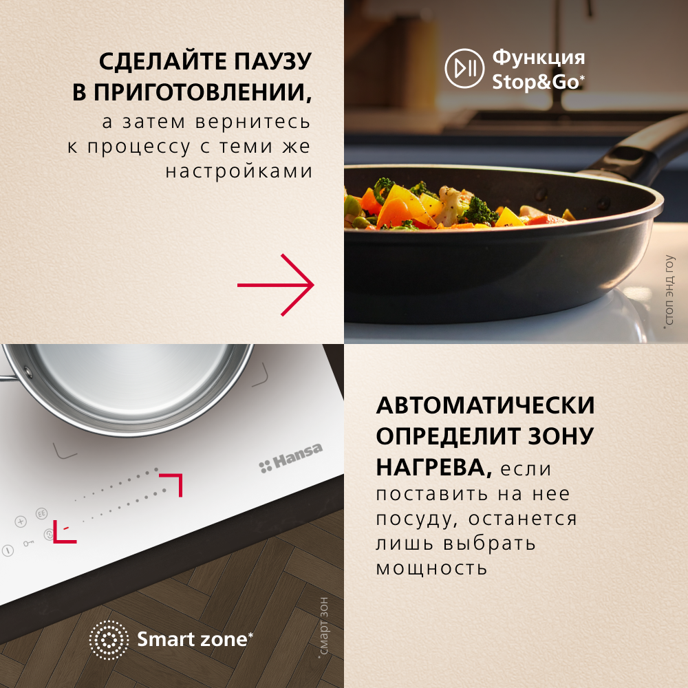 Индукционная варочная панель Hansa BHIW68600 в кипельно-белом цвете привнесет в вашу кухню ощущение свежести и чистоты. Прочная поверхность EUROKERA устойчива к нагрузкам и надолго сохраняет свой безупречный вид. Слайдерное управление обеспечивает плавную и точную регулировку мощности и времени. Функция Booster на время увеличивает мощность конфорки для максимально быстрого нагрева. Умная функция Hob&Go автоматически определяет зону, на которую вы поставили посуду, и подстраивает под нее нагрев. Система объединения зон (Мост и Автомост) позволяет готовить в посуде нестандартных размеров. Функция паузы Stop&Go мгновенно ставивает процесс готовки и так же легко его возобновляет. Таймер автоматического отключения, блокировка управления и индикация остаточного тепла делают использование панели удобным и безопасным. Девять уровней мощности дают полный контроль над процессом приготовления. Эта модель сочетает в себе элегантный дизайн и самые современные технологии для комфортной готовки каждый день.