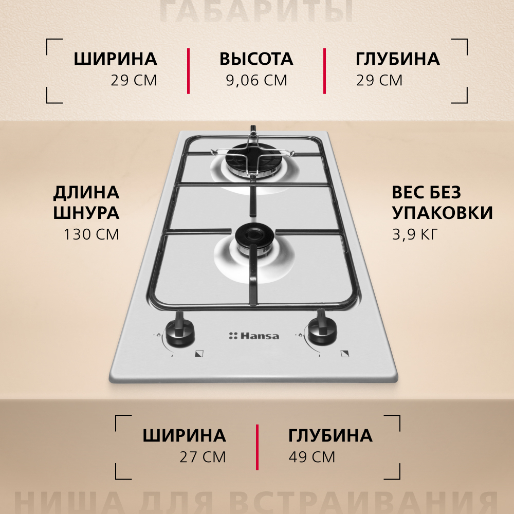 Газовая варочная поверхность Hansa BHGI310102 – компактное решение для пространств с нестандартной планировкой. Модель подойдет для малогабаритной кухни, квартиры-студии или дачного дома. Две разных по диаметру конфорки управляются удобными поворотными переключателями со встроенной опцией автоподжига. Съемная эмалированная решетка обеспечивает устойчивость посуды для готовки, а входящая в комплект подставка позволяет разместить небольшие емкости типа ковшика или турки. Серебристая поверхность панели из нержавеющей стали удобна в уходе и легко очищается от загрязнений, а также придает прибору презентабельный внешний вид, дополняя любое интерьерное решение.