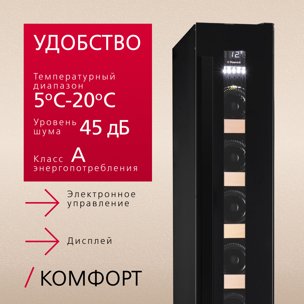 Встраиваемый винный шкаф Hansa FWC15061B в черном корпусе — это элегантное решение для хранения небольшой коллекции. Он вмещает до 6 бутылок на пяти деревянных полках, что идеально для знакомства с миром вина или для ценителя, имеющего несколько любимых экземпляров. Полезный объем 18 литров компактен, а стильный дизайн позволяет легко интегрировать шкаф в кухонный гарнитур. Электронное управление с дисплеем обеспечивает точную настройку температуры в диапазоне от 5°C до 20°C. Это важно, так как каждое вино раскрывается при своей температуре. Деревянные полки не только выглядят солидно, но и гасят вибрации компрессора, создавая идеальные условия для сохранения вкуса и аромата. Функция сигнала высокой температуры предупредит вас, если условия хранения нарушатся. LED-подсветка мягко освещает бутылки, а перенавешиваемые двери позволяют выбрать удобную сторону открывания. Компрессорная система охлаждения работает тихо, ее уровень шума составляет всего 40 дБ. Класс энергопотребления А гарантирует экономичную эксплуатацию.