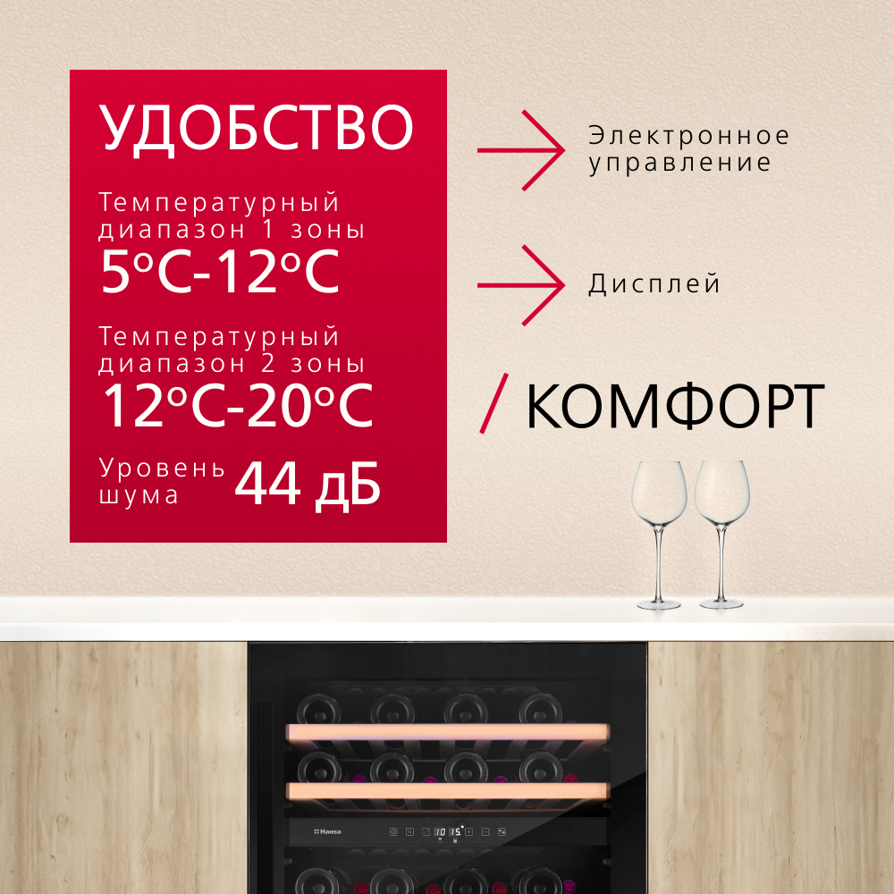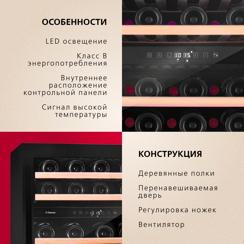 Встраиваемый винный шкаф Hansa FWC60461B предлагает профессиональный подход к хранению вина. Это полноценная двухзонная модель, которую можно интегрировать в кухонный гарнитур. Вместимость в 46 бутылок удовлетворяет потребности серьезного ценителя. Первая зона поддерживает диапазон от 5 до 12°C, идеальный для белых, розовых и игристых вин. Вторая зона настроена на диапазон от 12 до 20°C, что оптимально для красных вин. Управление осуществляется электронно, панель расположена внутри для лаконичного внешнего вида. Шесть деревянных полок в каждой зоне обеспечивают правильное горизонтальное хранение и защищают вино от вредных вибраций. Вентилятор поддерживает стабильную циркуляцию воздуха. Сигнал высокой температуры обеспечивает дополнительную защиту коллекции. Уровень шума всего 40 дБ, что позволяет встроить шкаф даже в жилую зону. Двери можно перенавесить, а LED-подсветка деликатно представит вашу коллекцию в лучшем свете. Это решение для тех, кто подходит к хранению вина с истинным вниманием к деталям.